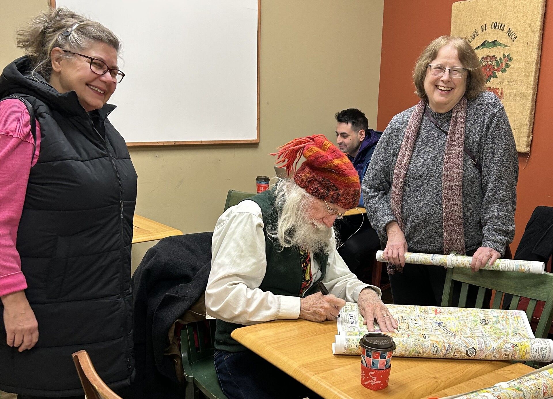 Map winners, Mavis and Leslie, with Ed King, local cartoonist, signing